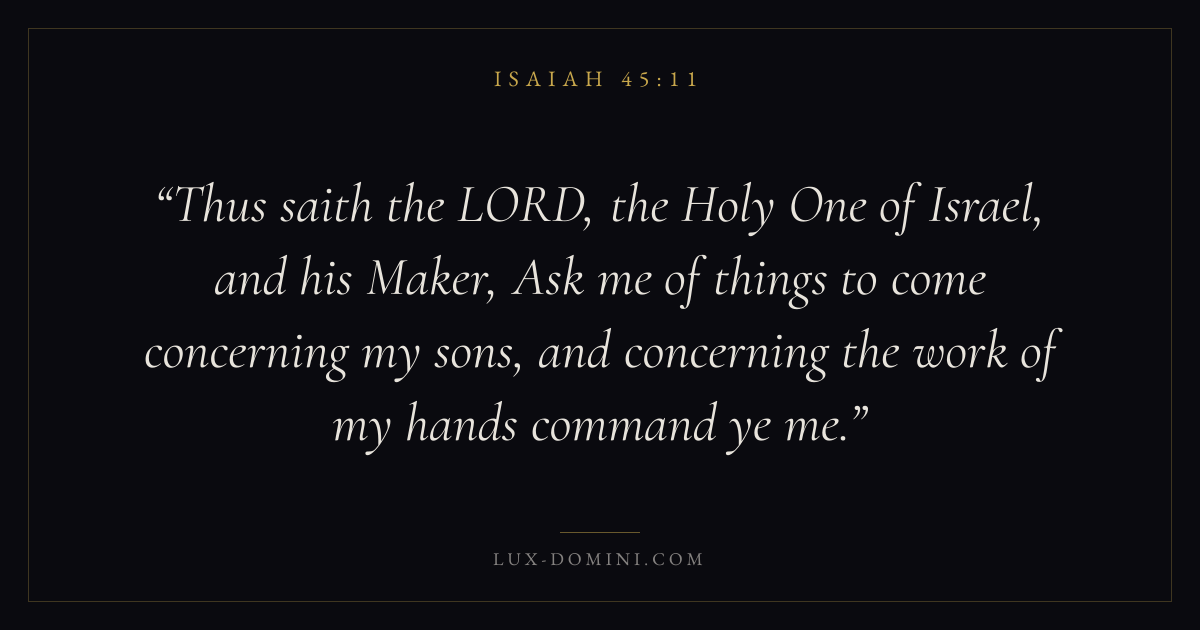 Thus saith the LORD, the Holy One of Israel, and his Maker, Ask me of things to come concerning my sons, and concerning the work of my hands command ye me.