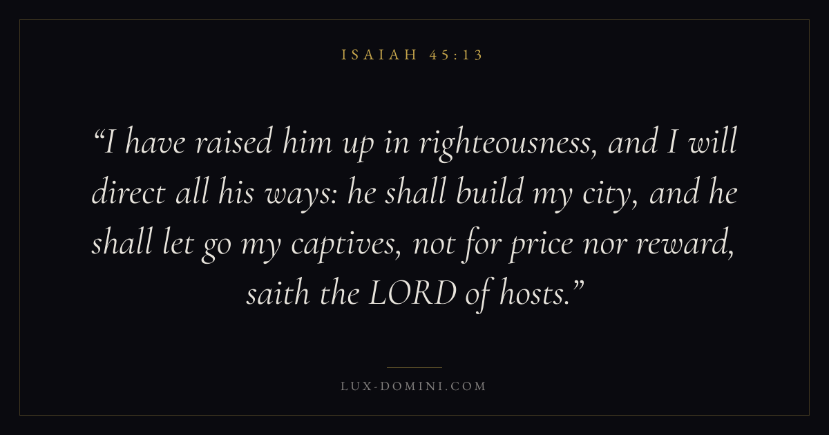 I have raised him up in righteousness, and I will direct all his ways: he shall build my city, and he shall let go my captives, not for price nor reward, saith the LORD of hosts.