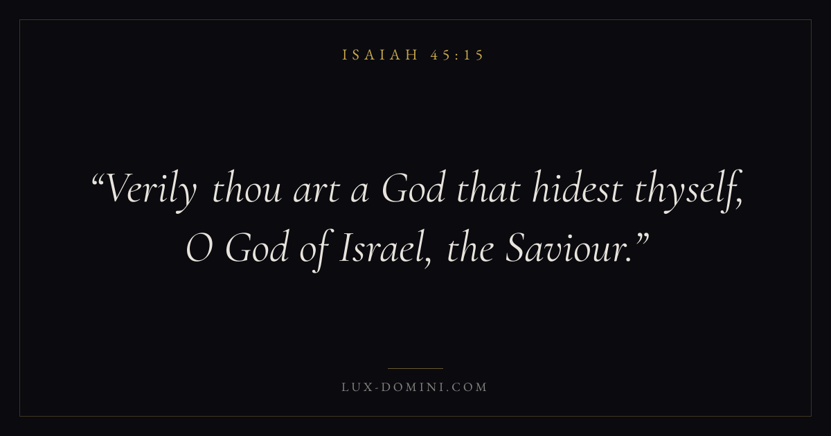 Books / Isaiah / Chapter 45 / Verse 15 ← Isaiah 45:14 Isaiah 45:15 Isaiah 45:16 → Verily thou art a God that hidest thyself, O God of Israel, the Saviour. Download verse card Share on Twitter Share on Facebook Pin it ✦ Key themes PrayerJustice and mercyHolinessJudgment Read with Isaiah 45:13Isaiah 45:14Matthew 6:9Luke 18:1 Related topics Bible verses about prayerBible verses about justice and mercy ✦ Isaiah Chapter 45 verses V. 1 V. 2 V. 3 V. 4 V. 5 V. 6 V. 7 V. 8 V. 9 V. 10 V. 11 V. 12 V. 13 V. 14 V. 15 V. 16 V. 17 V. 18 V. 19 V. 20 V. 21 V. 22 V. 23 V. 24 V. 25