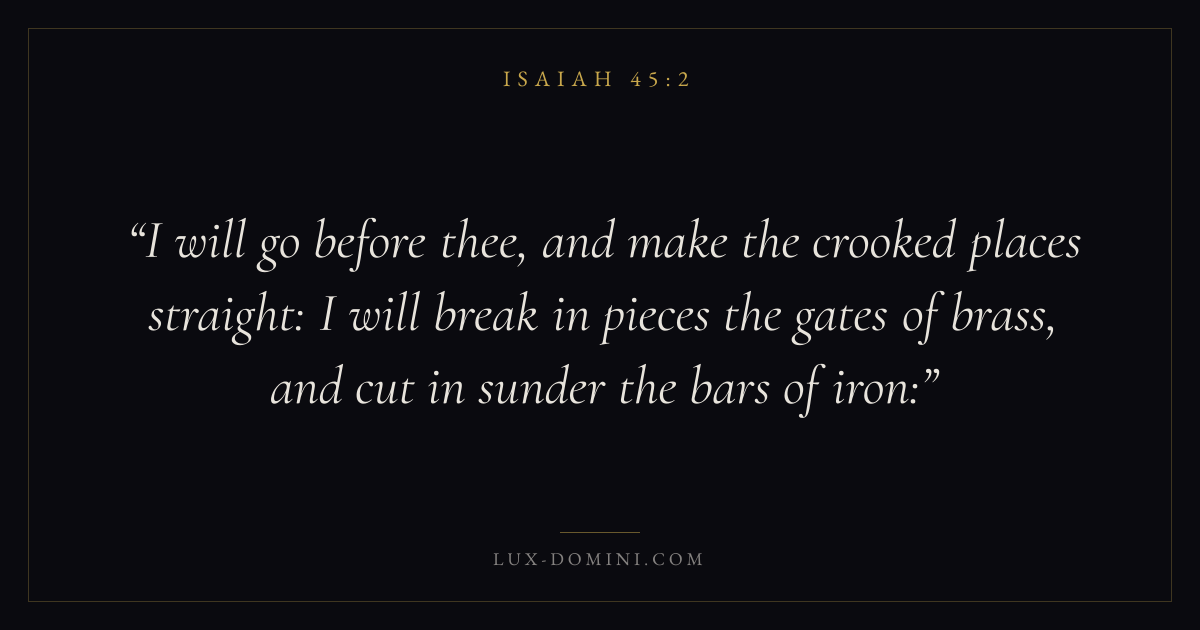 I will go before thee, and make the crooked places straight: I will break in pieces the gates of brass, and cut in sunder the bars of iron: