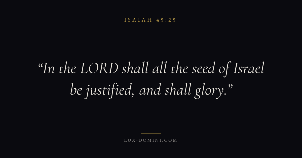 Books / Isaiah / Chapter 45 / Verse 25 ← Isaiah 45:24 Isaiah 45:25 Isaiah 46:1 → In the LORD shall all the seed of Israel be justified, and shall glory. Download verse card Share on Twitter Share on Facebook Pin it ✦ Key themes Justice and mercySalvationHolinessJudgment Read with Isaiah 45:24Micah 6:8Amos 5:24John 3:16 Related topics Bible verses about justice and mercyBible verses about salvation ✦ Isaiah Chapter 45 verses V. 1 V. 2 V. 3 V. 4 V. 5 V. 6 V. 7 V. 8 V. 9 V. 10 V. 11 V. 12 V. 13 V. 14 V. 15 V. 16 V. 17 V. 18 V. 19 V. 20 V. 21 V. 22 V. 23 V. 24 V. 25