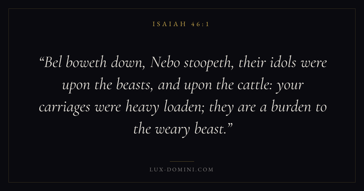 Bel boweth down, Nebo stoopeth, their idols were upon the beasts, and upon the cattle: your carriages were heavy loaden; they are a burden to the weary beast.