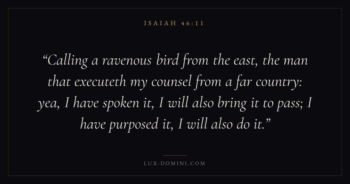 Calling a ravenous bird from the east, the man that executeth my counsel from a far country: yea, I have spoken it, I will also bring it to pass; I have purposed it, I will also do it.