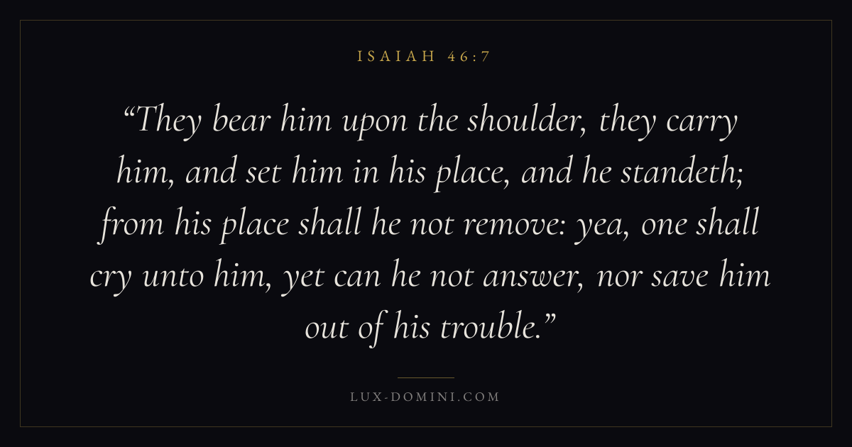They bear him upon the shoulder, they carry him, and set him in his place, and he standeth; from his place shall he not remove: yea, one shall cry unto him, yet can he not answer, nor save him out of his trouble.
