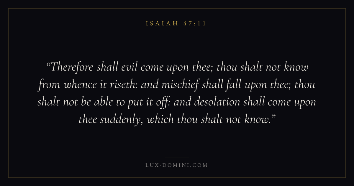 Therefore shall evil come upon thee; thou shalt not know from whence it riseth: and mischief shall fall upon thee; thou shalt not be able to put it off: and desolation shall come upon thee suddenly, which thou shalt not know.