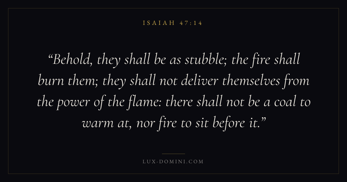 Behold, they shall be as stubble; the fire shall burn them; they shall not deliver themselves from the power of the flame: there shall not be a coal to warm at, nor fire to sit before it.