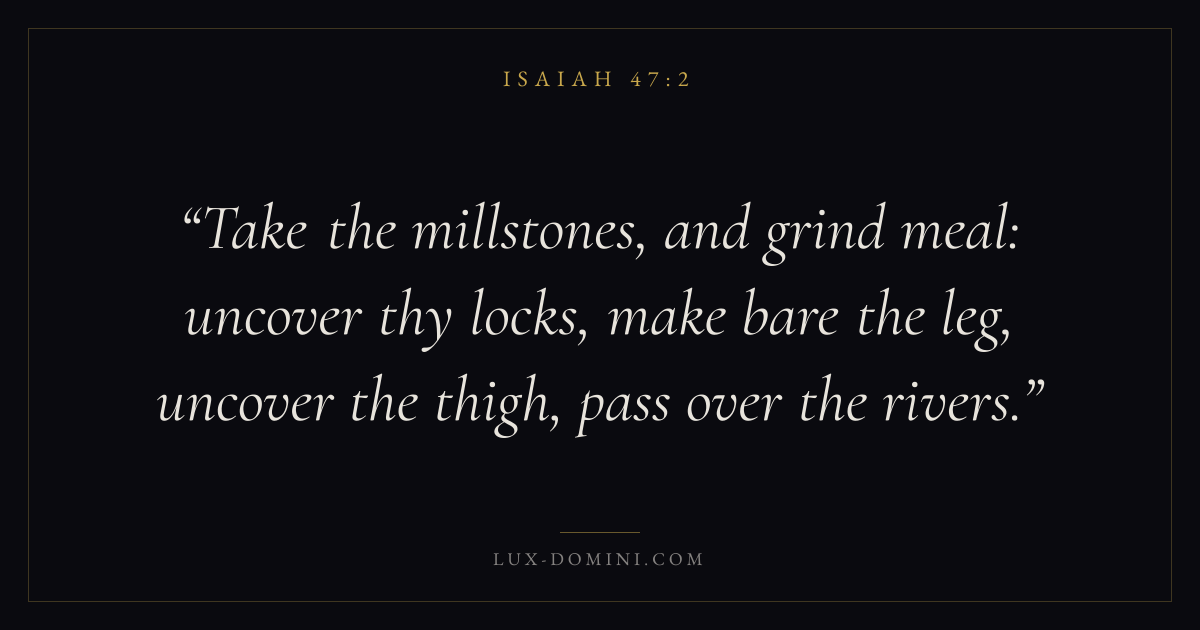 Take the millstones, and grind meal: uncover thy locks, make bare the leg, uncover the thigh, pass over the rivers.