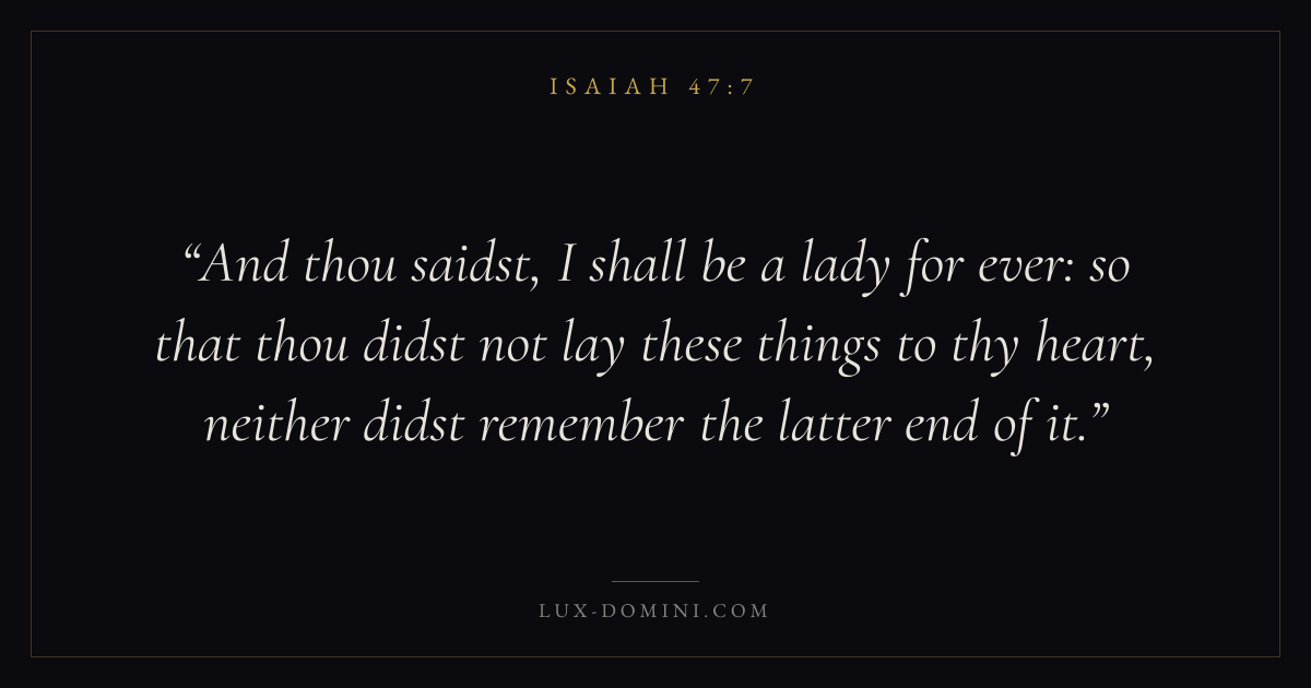 And thou saidst, I shall be a lady for ever: so that thou didst not lay these things to thy heart, neither didst remember the latter end of it.