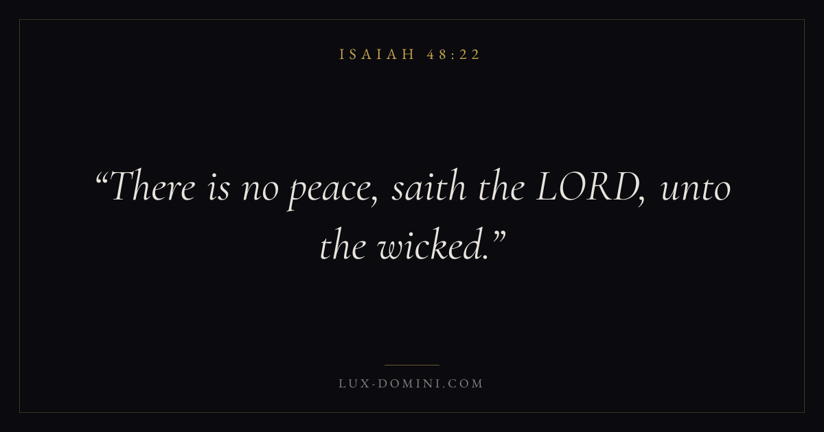 Books / Isaiah / Chapter 48 / Verse 22 ← Isaiah 48:21 Isaiah 48:22 Isaiah 49:1 → There is no peace, saith the LORD, unto the wicked. Download verse card Share on Twitter Share on Facebook Pin it ✦ Key themes Justice and mercyPeaceHolinessJudgment Read with Isaiah 48:20Isaiah 48:21Micah 6:8Amos 5:24 Related topics Bible verses about justice and mercyBible verses about peace ✦ Isaiah Chapter 48 verses V. 1 V. 2 V. 3 V. 4 V. 5 V. 6 V. 7 V. 8 V. 9 V. 10 V. 11 V. 12 V. 13 V. 14 V. 15 V. 16 V. 17 V. 18 V. 19 V. 20 V. 21 V. 22