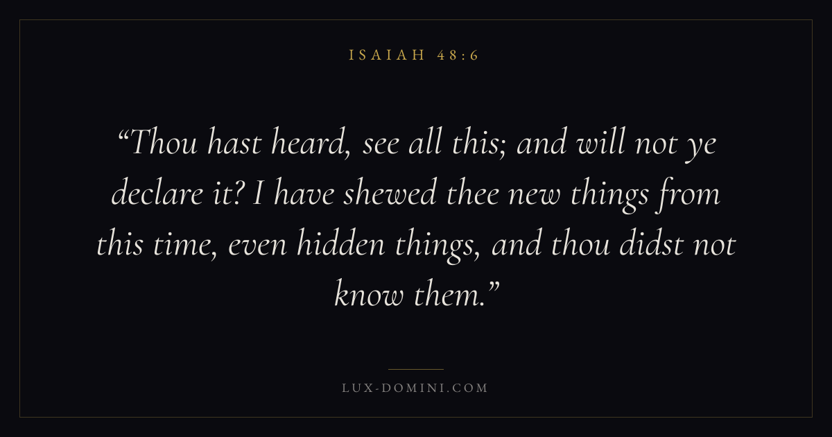 Thou hast heard, see all this; and will not ye declare it? I have shewed thee new things from this time, even hidden things, and thou didst not know them.