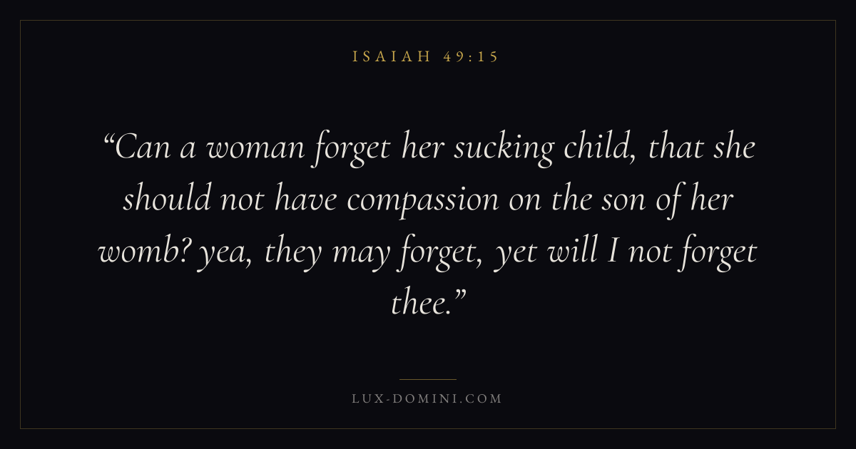 Can a woman forget her sucking child, that she should not have compassion on the son of her womb? yea, they may forget, yet will I not forget thee.
