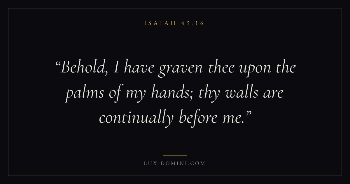 Behold, I have graven thee upon the palms of my hands; thy walls are continually before me.