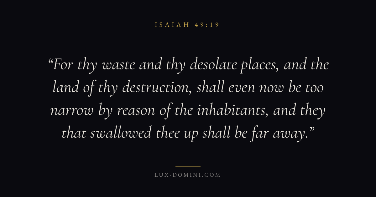 For thy waste and thy desolate places, and the land of thy destruction, shall even now be too narrow by reason of the inhabitants, and they that swallowed thee up shall be far away.