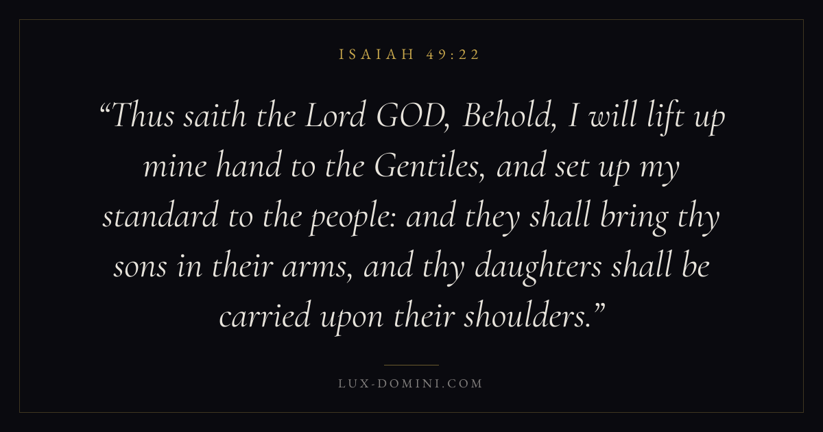 Thus saith the Lord GOD, Behold, I will lift up mine hand to the Gentiles, and set up my standard to the people: and they shall bring thy sons in their arms, and thy daughters shall be carried upon their shoulders.