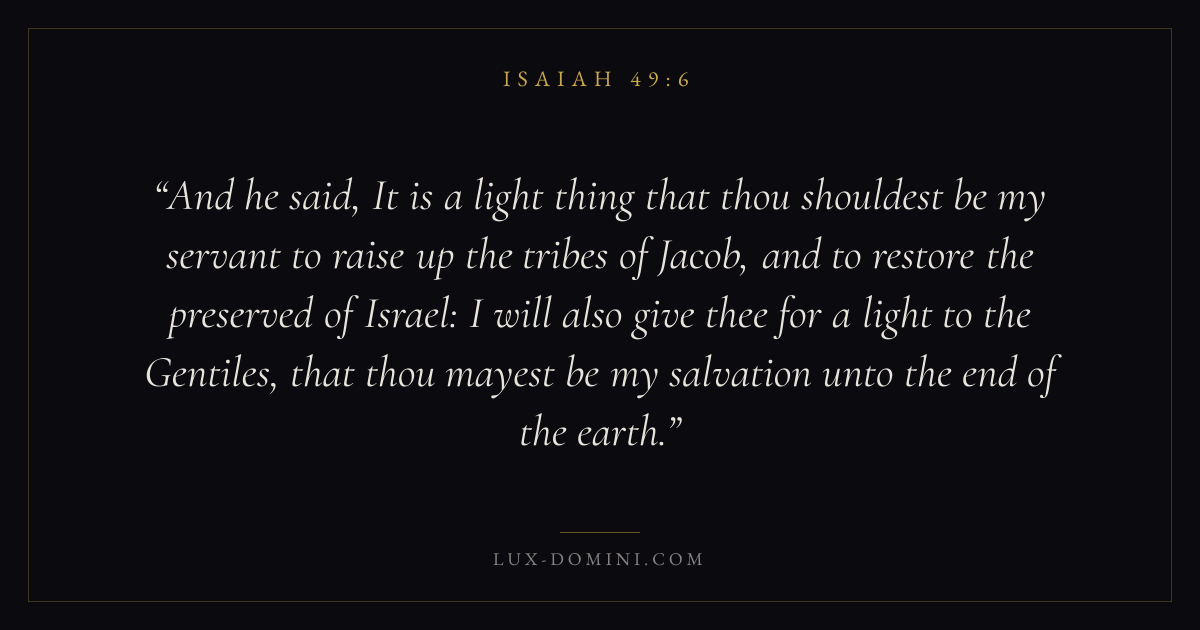 And he said, It is a light thing that thou shouldest be my servant to raise up the tribes of Jacob, and to restore the preserved of Israel: I will also give thee for a light to the Gentiles, that thou mayest be my salvation unto the end of the earth.