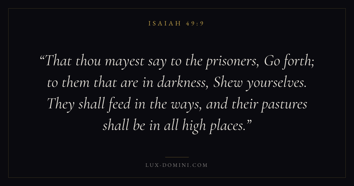That thou mayest say to the prisoners, Go forth; to them that are in darkness, Shew yourselves. They shall feed in the ways, and their pastures shall be in all high places.