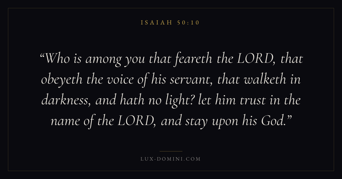 Who is among you that feareth the LORD, that obeyeth the voice of his servant, that walketh in darkness, and hath no light? let him trust in the name of the LORD, and stay upon his God.