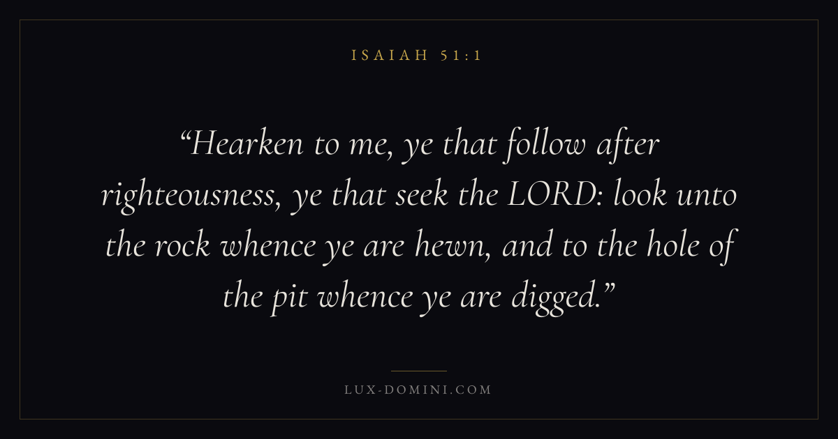 Hearken to me, ye that follow after righteousness, ye that seek the LORD: look unto the rock whence ye are hewn, and to the hole of the pit whence ye are digged.