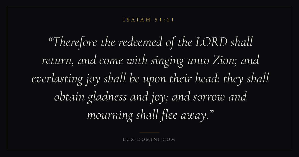 Therefore the redeemed of the LORD shall return, and come with singing unto Zion; and everlasting joy shall be upon their head: they shall obtain gladness and joy; and sorrow and mourning shall flee away.