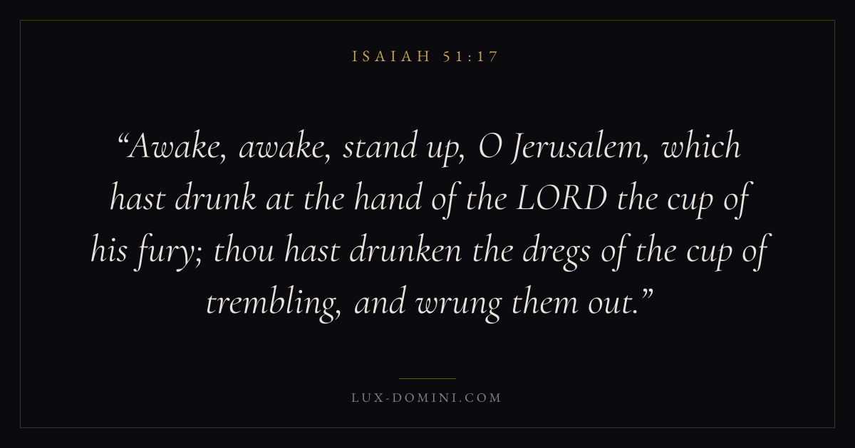 Awake, awake, stand up, O Jerusalem, which hast drunk at the hand of the LORD the cup of his fury; thou hast drunken the dregs of the cup of trembling, and wrung them out.