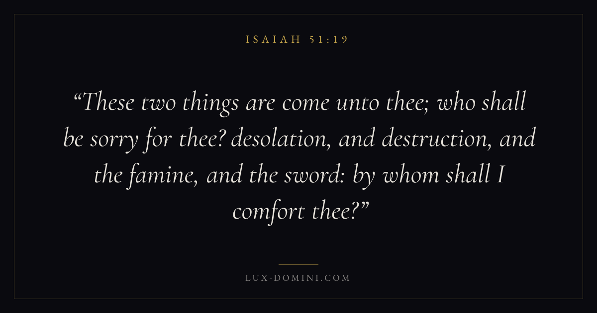 These two things are come unto thee; who shall be sorry for thee? desolation, and destruction, and the famine, and the sword: by whom shall I comfort thee?