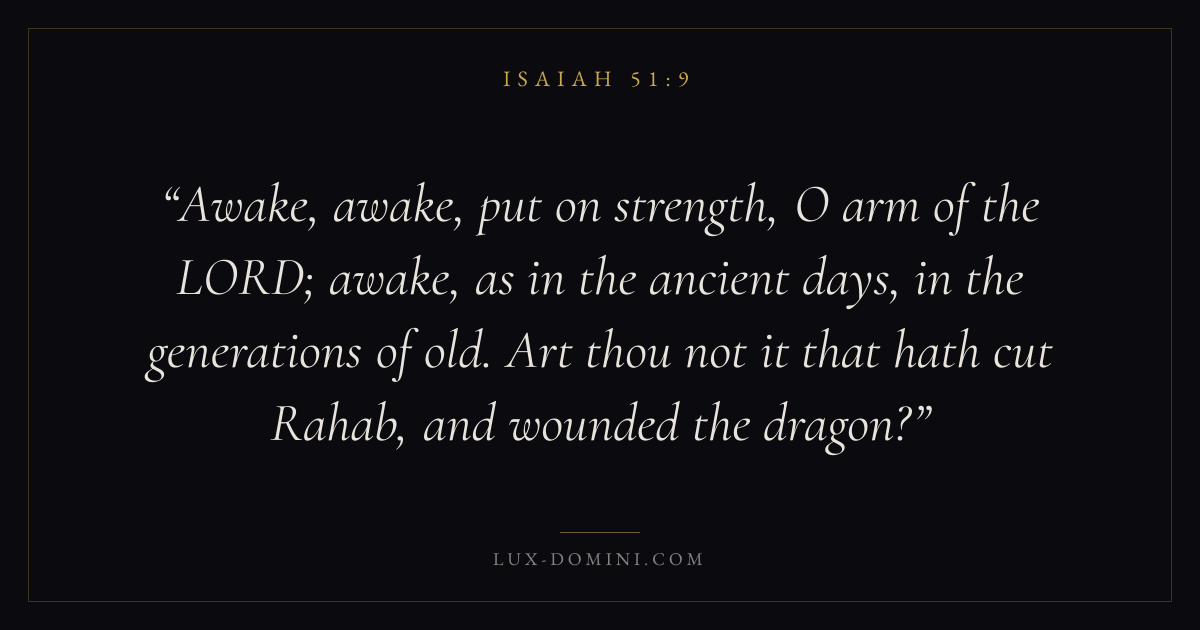 Awake, awake, put on strength, O arm of the LORD; awake, as in the ancient days, in the generations of old. Art thou not it that hath cut Rahab, and wounded the dragon?