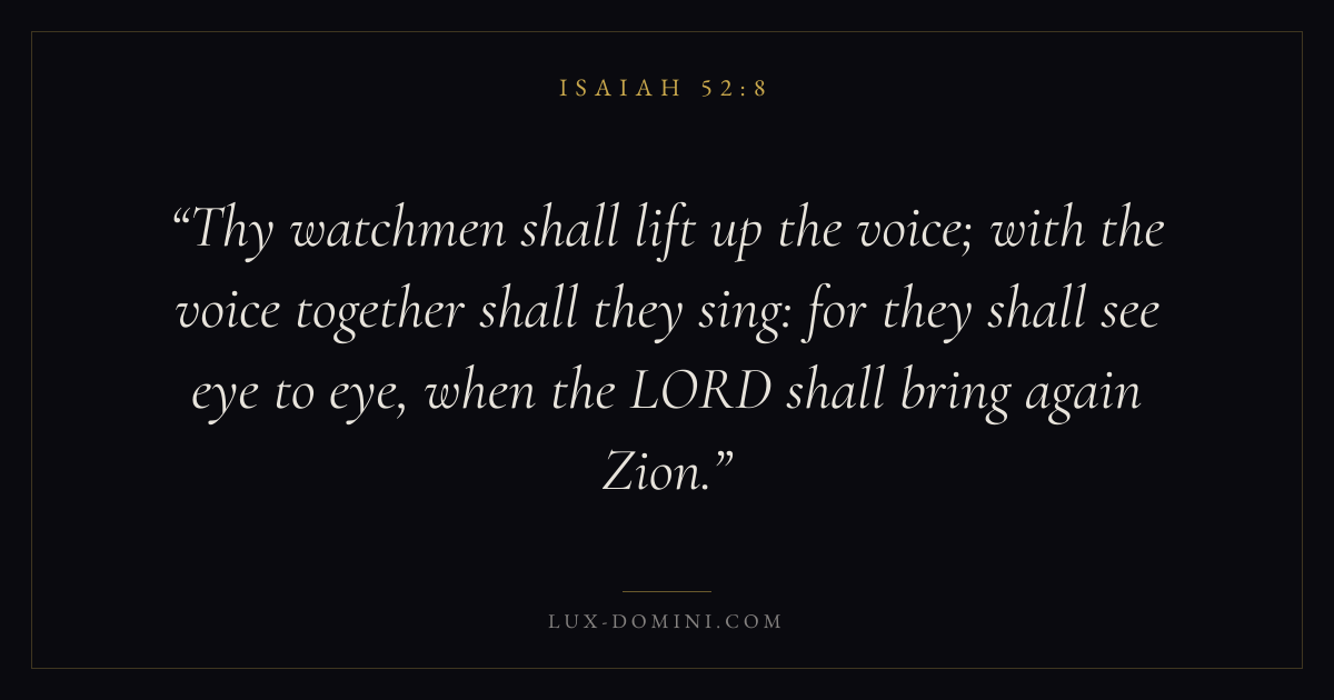 Thy watchmen shall lift up the voice; with the voice together shall they sing: for they shall see eye to eye, when the LORD shall bring again Zion.