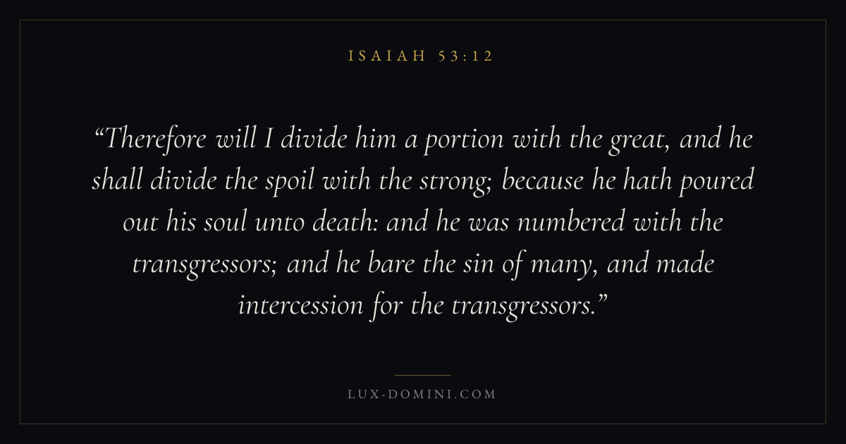 Therefore will I divide him a portion with the great, and he shall divide the spoil with the strong; because he hath poured out his soul unto death: and he was numbered with the transgressors; and he bare the sin of many, and made intercession for the transgressors.