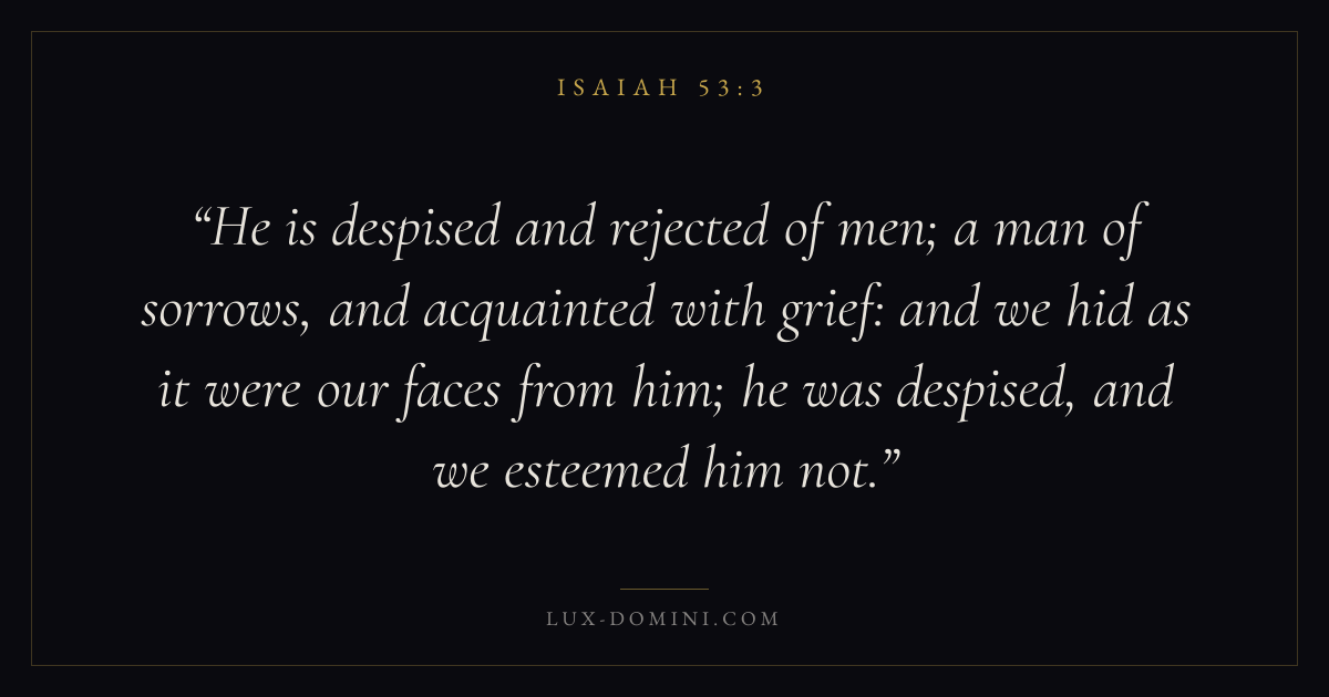 He is despised and rejected of men; a man of sorrows, and acquainted with grief: and we hid as it were our faces from him; he was despised, and we esteemed him not.