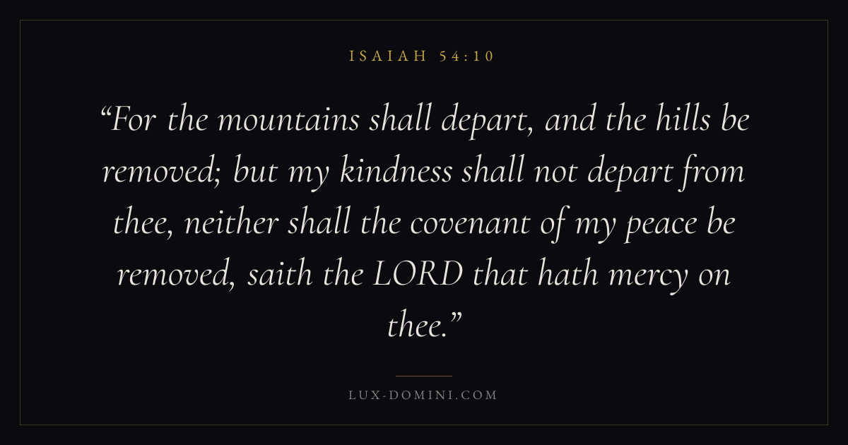 For the mountains shall depart, and the hills be removed; but my kindness shall not depart from thee, neither shall the covenant of my peace be removed, saith the LORD that hath mercy on thee.
