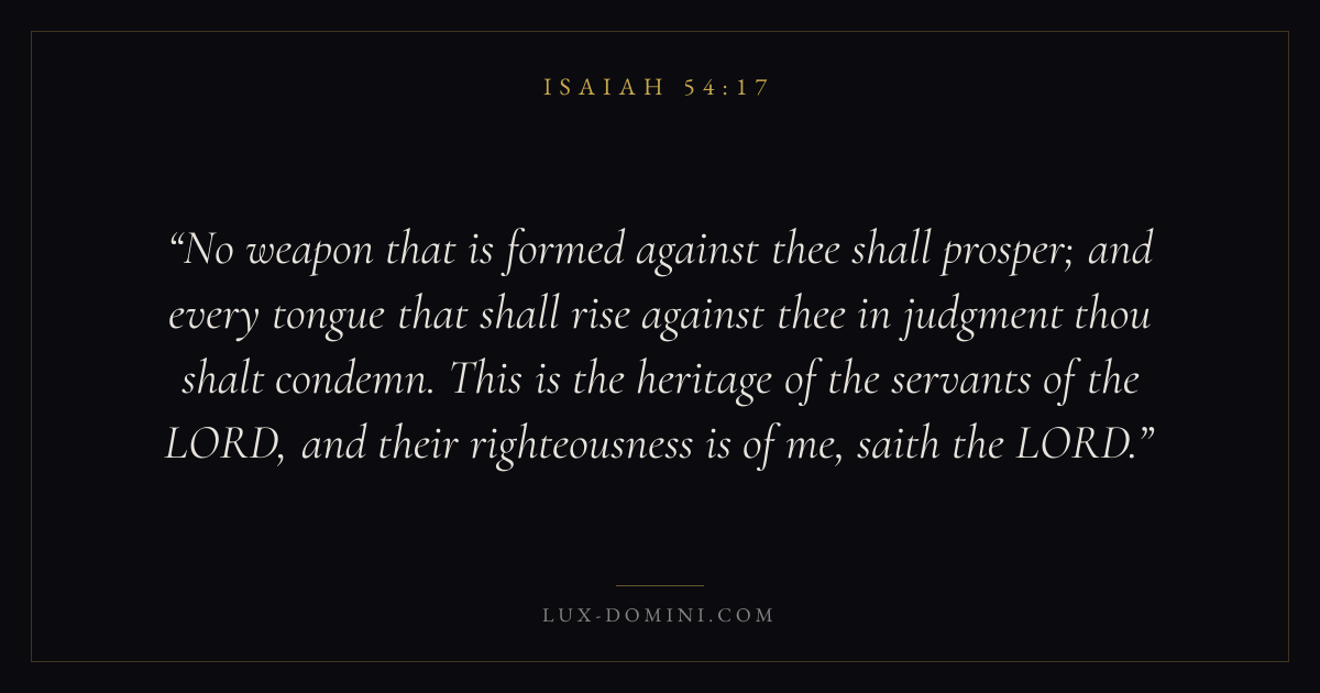 No weapon that is formed against thee shall prosper; and every tongue that shall rise against thee in judgment thou shalt condemn. This is the heritage of the servants of the LORD, and their righteousness is of me, saith the LORD.