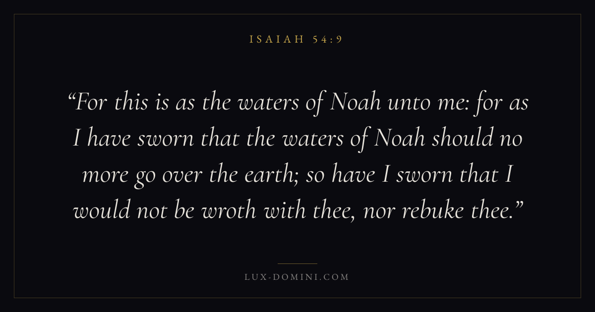 For this is as the waters of Noah unto me: for as I have sworn that the waters of Noah should no more go over the earth; so have I sworn that I would not be wroth with thee, nor rebuke thee.