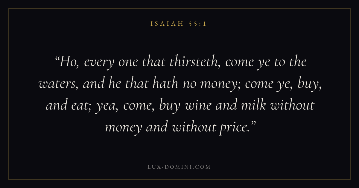 Ho, every one that thirsteth, come ye to the waters, and he that hath no money; come ye, buy, and eat; yea, come, buy wine and milk without money and without price.