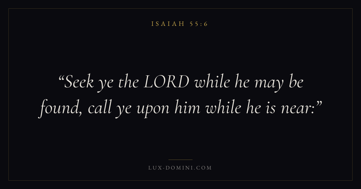 Books / Isaiah / Chapter 55 / Verse 6 ← Isaiah 55:5 Isaiah 55:6 Isaiah 55:7 → Seek ye the LORD while he may be found, call ye upon him while he is near: Download verse card Share on Twitter Share on Facebook Pin it ✦ Key themes Justice and mercyForgivenessPeaceGraceHoliness Read with Isaiah 55:7Micah 6:8Amos 5:24Ephesians 4:32 Related topics Bible verses about justice and mercyBible verses about forgivenessBible verses about peaceBible verses about grace ✦ Isaiah Chapter 55 verses V. 1 V. 2 V. 3 V. 4 V. 5 V. 6 V. 7 V. 8 V. 9 V. 10 V. 11 V. 12 V. 13