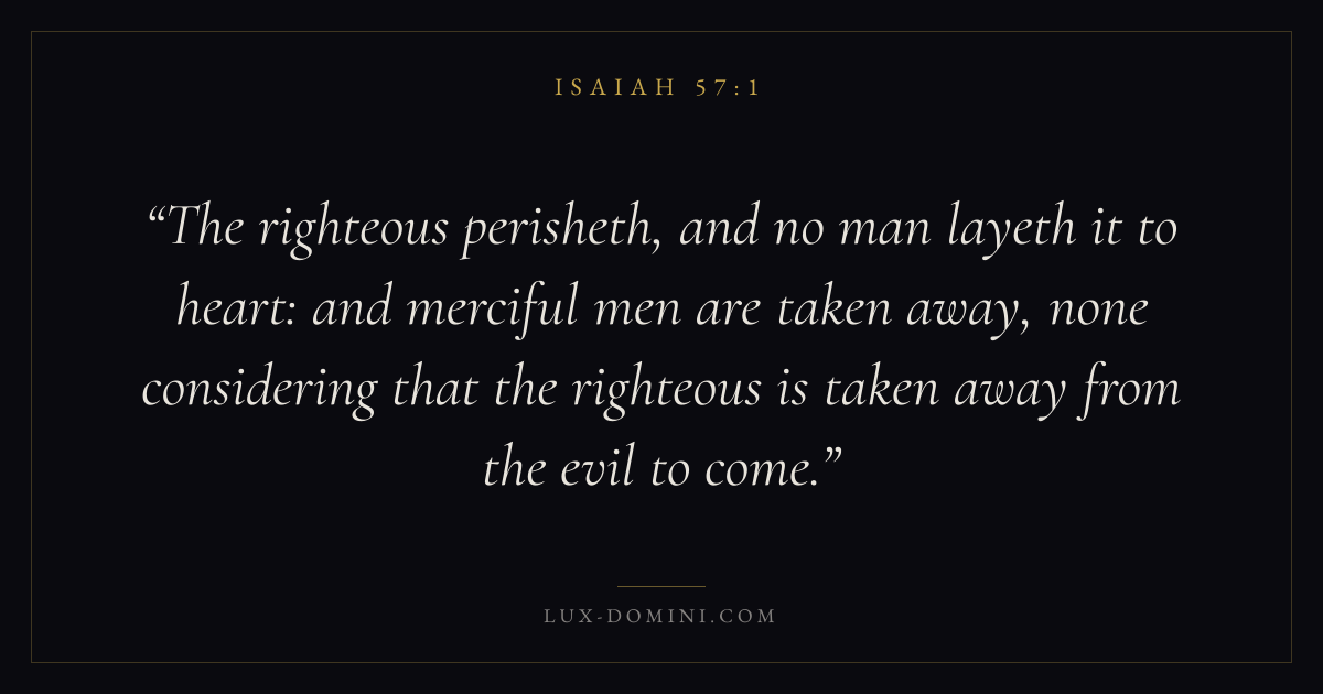 The righteous perisheth, and no man layeth it to heart: and merciful men are taken away, none considering that the righteous is taken away from the evil to come.