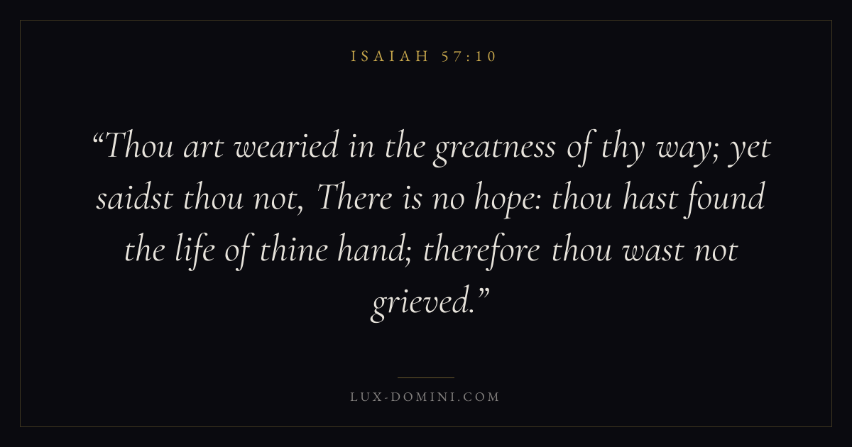 Thou art wearied in the greatness of thy way; yet saidst thou not, There is no hope: thou hast found the life of thine hand; therefore thou wast not grieved.