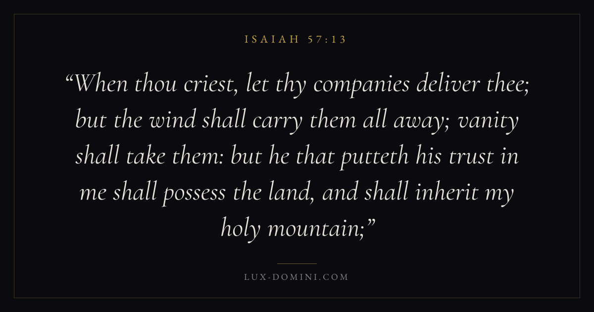 When thou criest, let thy companies deliver thee; but the wind shall carry them all away; vanity shall take them: but he that putteth his trust in me shall possess the land, and shall inherit my holy mountain;
