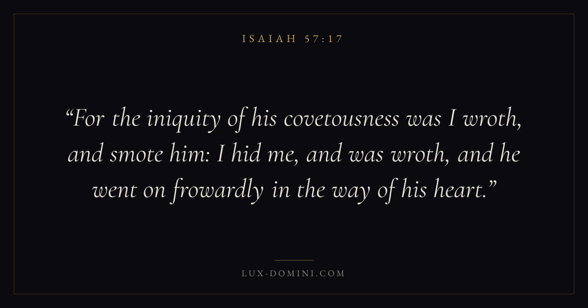 For the iniquity of his covetousness was I wroth, and smote him: I hid me, and was wroth, and he went on frowardly in the way of his heart.