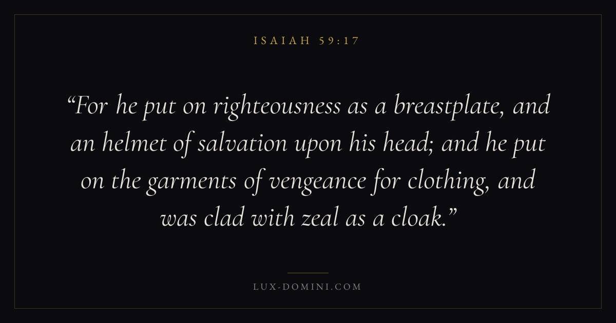 For he put on righteousness as a breastplate, and an helmet of salvation upon his head; and he put on the garments of vengeance for clothing, and was clad with zeal as a cloak.