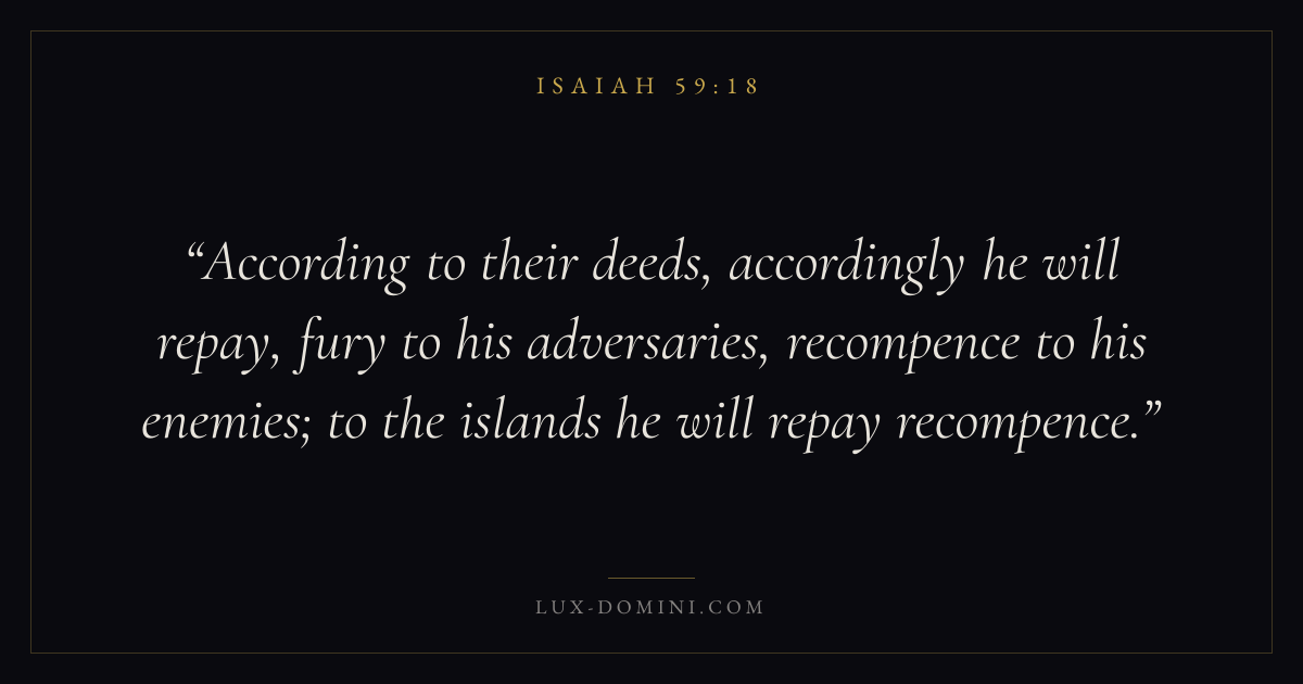 According to their deeds, accordingly he will repay, fury to his adversaries, recompence to his enemies; to the islands he will repay recompence.