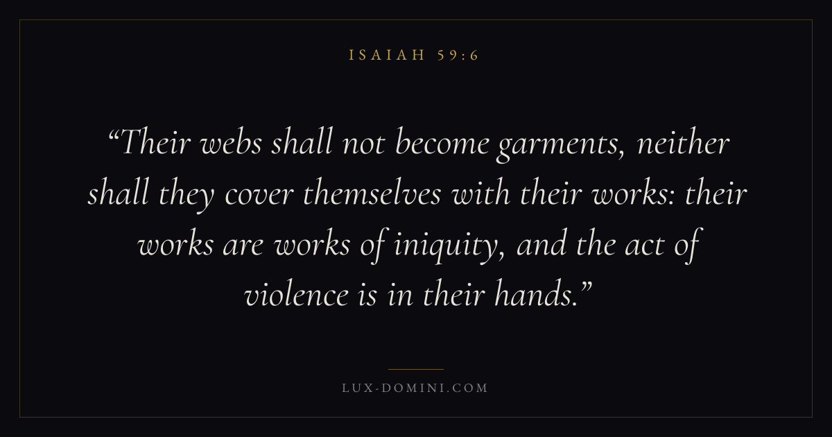 Their webs shall not become garments, neither shall they cover themselves with their works: their works are works of iniquity, and the act of violence is in their hands.