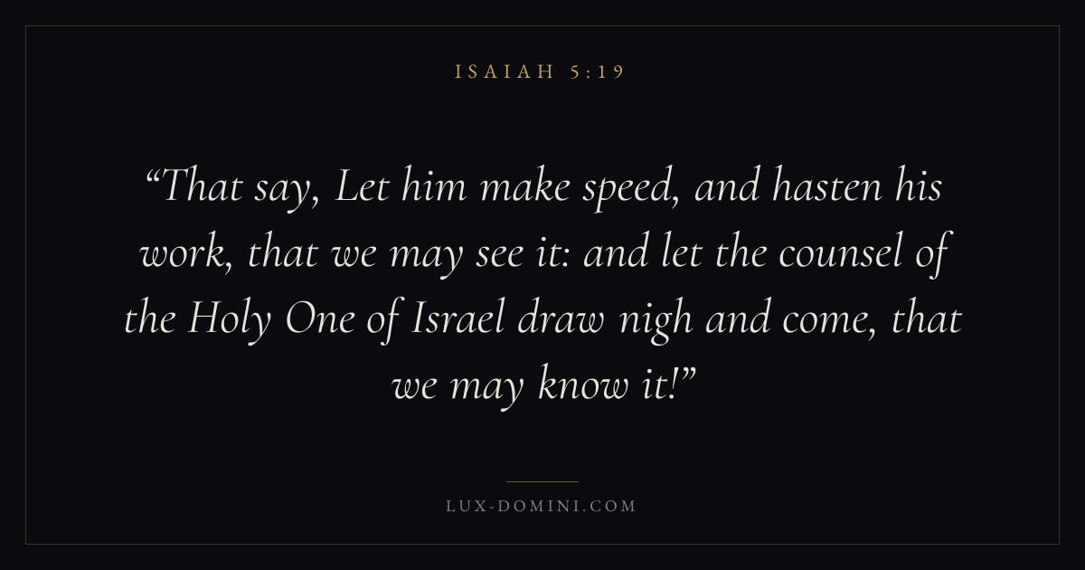 That say, Let him make speed, and hasten his work, that we may see it: and let the counsel of the Holy One of Israel draw nigh and come, that we may know it!