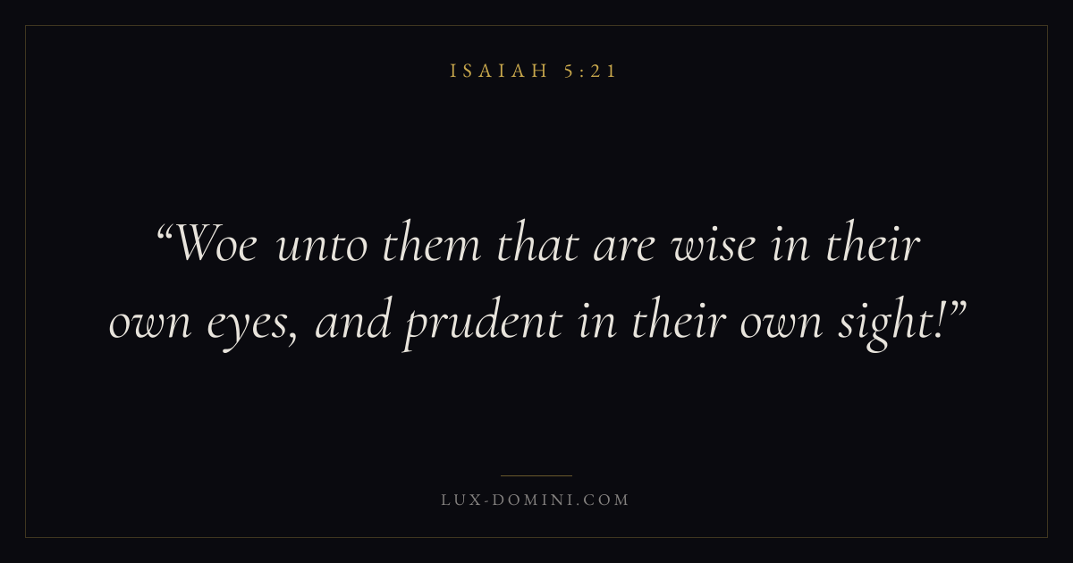 Books / Isaiah / Chapter 5 / Verse 21 ← Isaiah 5:20 Isaiah 5:21 Isaiah 5:22 → Woe unto them that are wise in their own eyes, and prudent in their own sight! Download verse card Share on Twitter Share on Facebook Pin it ✦ Key themes WisdomJustice and mercyHolinessJudgment Read with Isaiah 5:20Proverbs 1:7James 1:5Micah 6:8 Related topics Bible verses about wisdomBible verses about justice and mercy ✦ Isaiah Chapter 5 verses V. 1 V. 2 V. 3 V. 4 V. 5 V. 6 V. 7 V. 8 V. 9 V. 10 V. 11 V. 12 V. 13 V. 14 V. 15 V. 16 V. 17 V. 18 V. 19 V. 20 V. 21 V. 22 V. 23 V. 24 V. 25 V. 26 V. 27 V. 28 V. 29 V. 30