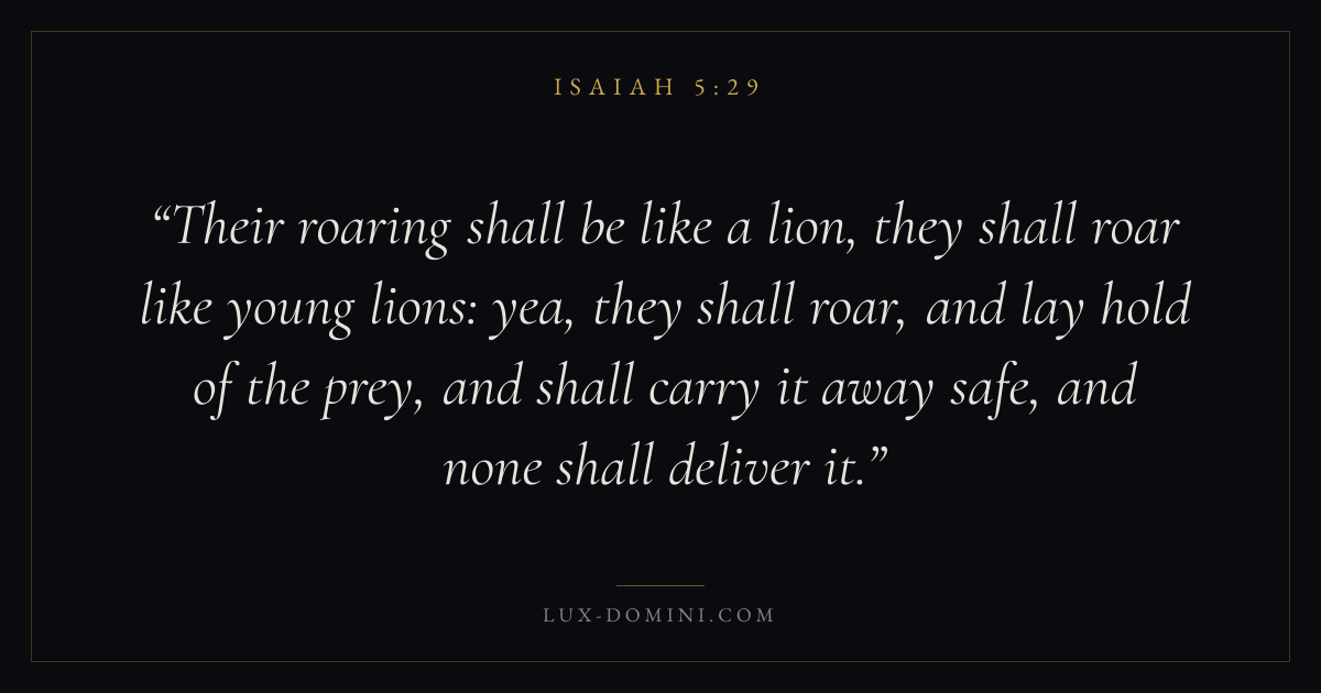Their roaring shall be like a lion, they shall roar like young lions: yea, they shall roar, and lay hold of the prey, and shall carry it away safe, and none shall deliver it.