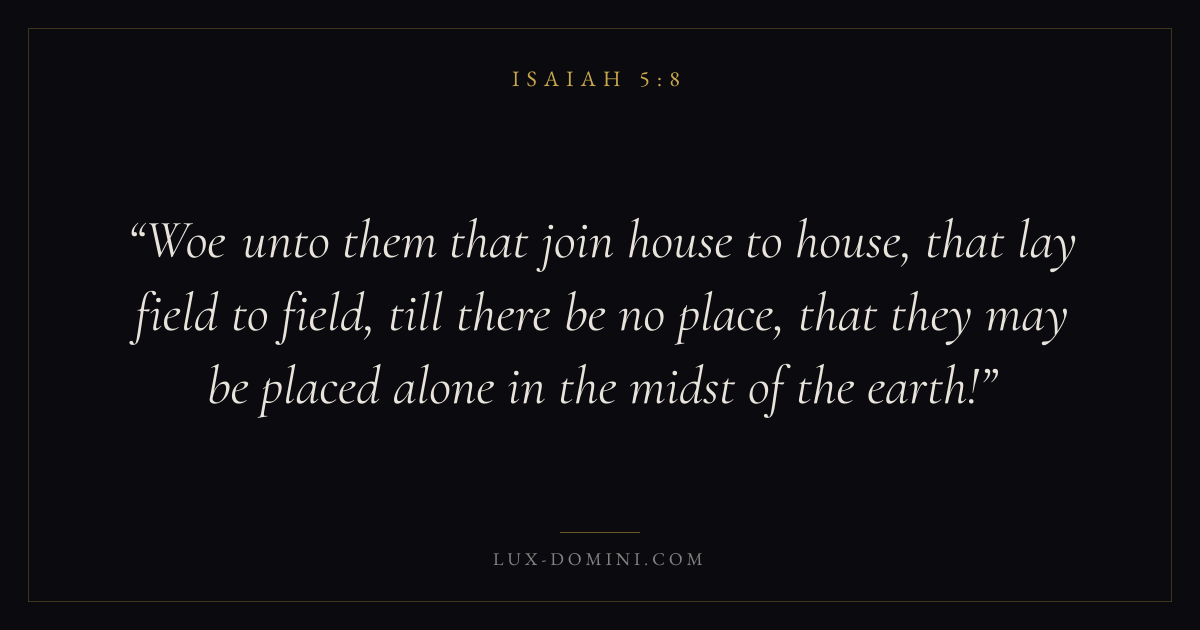 Woe unto them that join house to house, that lay field to field, till there be no place, that they may be placed alone in the midst of the earth!