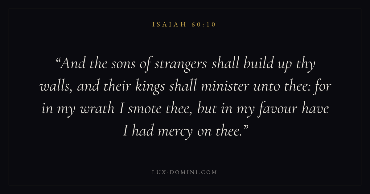 And the sons of strangers shall build up thy walls, and their kings shall minister unto thee: for in my wrath I smote thee, but in my favour have I had mercy on thee.