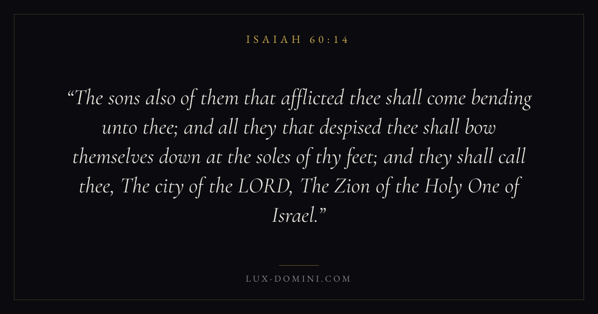 The sons also of them that afflicted thee shall come bending unto thee; and all they that despised thee shall bow themselves down at the soles of thy feet; and they shall call thee, The city of the LORD, The Zion of the Holy One of Israel.