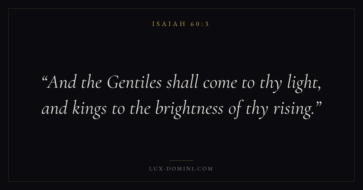 Books / Isaiah / Chapter 60 / Verse 3 ← Isaiah 60:2 Isaiah 60:3 Isaiah 60:4 → And the Gentiles shall come to thy light, and kings to the brightness of thy rising. Download verse card Share on Twitter Share on Facebook Pin it ✦ Key themes WisdomJustice and mercyHolinessJudgment Read with Isaiah 60:1Isaiah 60:2Proverbs 1:7James 1:5 Related topics Bible verses about wisdomBible verses about justice and mercy ✦ Isaiah Chapter 60 verses V. 1 V. 2 V. 3 V. 4 V. 5 V. 6 V. 7 V. 8 V. 9 V. 10 V. 11 V. 12 V. 13 V. 14 V. 15 V. 16 V. 17 V. 18 V. 19 V. 20 V. 21 V. 22