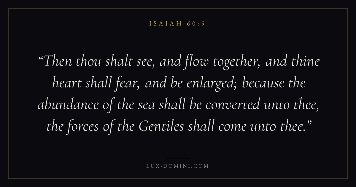Then thou shalt see, and flow together, and thine heart shall fear, and be enlarged; because the abundance of the sea shall be converted unto thee, the forces of the Gentiles shall come unto thee.