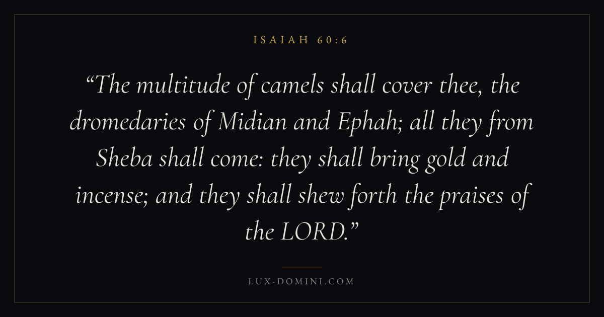 The multitude of camels shall cover thee, the dromedaries of Midian and Ephah; all they from Sheba shall come: they shall bring gold and incense; and they shall shew forth the praises of the LORD.